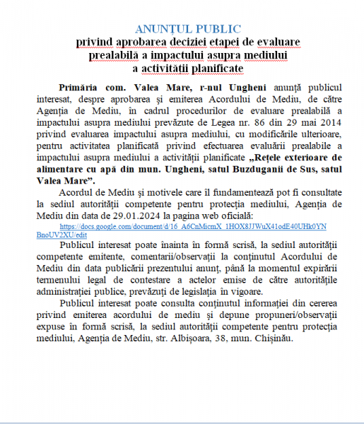 Anunț privind aprobarea deciziei etapei de evaluare prealabilă a impactului asupra mediului a activității planificate
