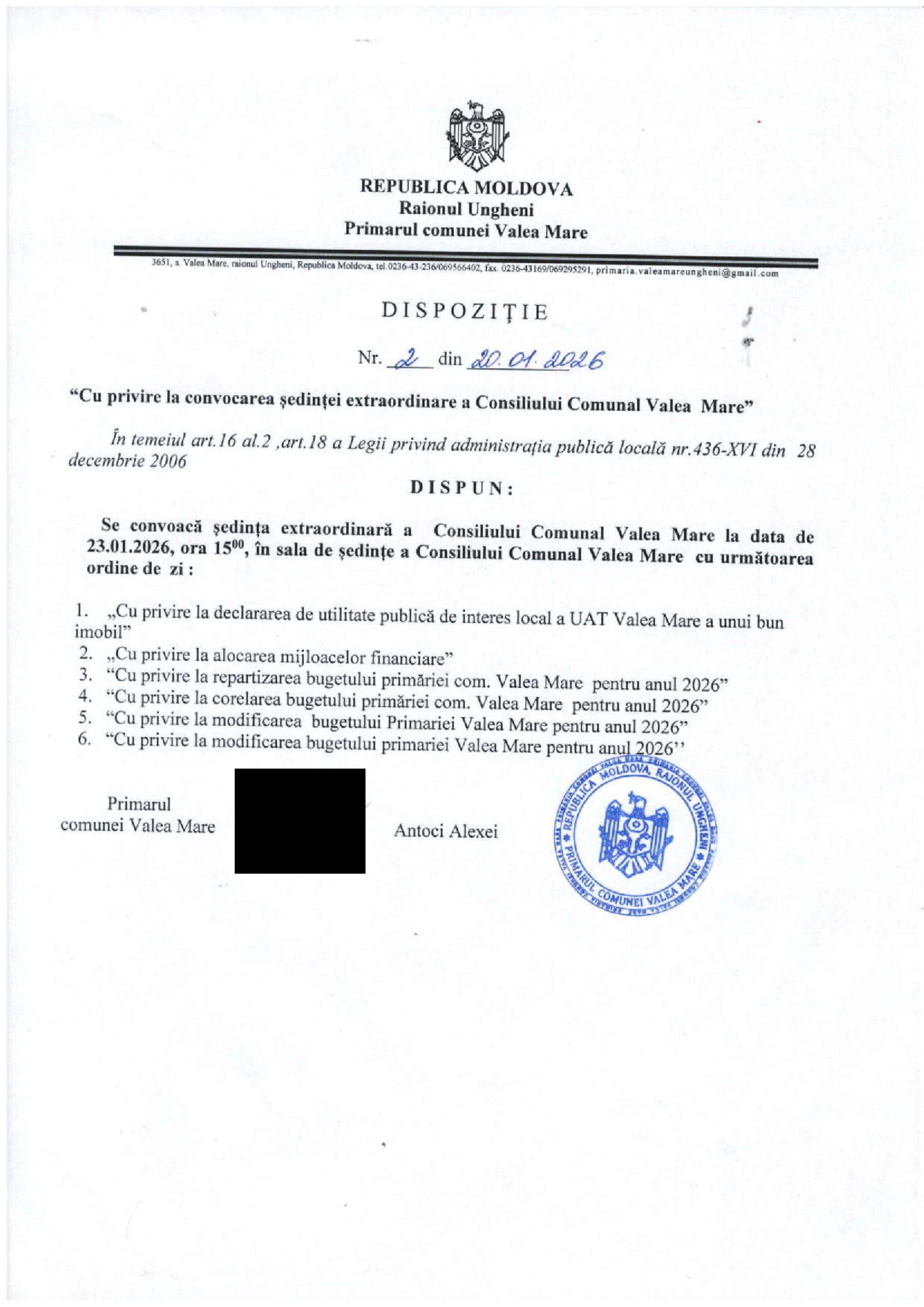 Anunț cu privire la convocarea ședinței extraordinare a Consiliului Comunal Valea Mare