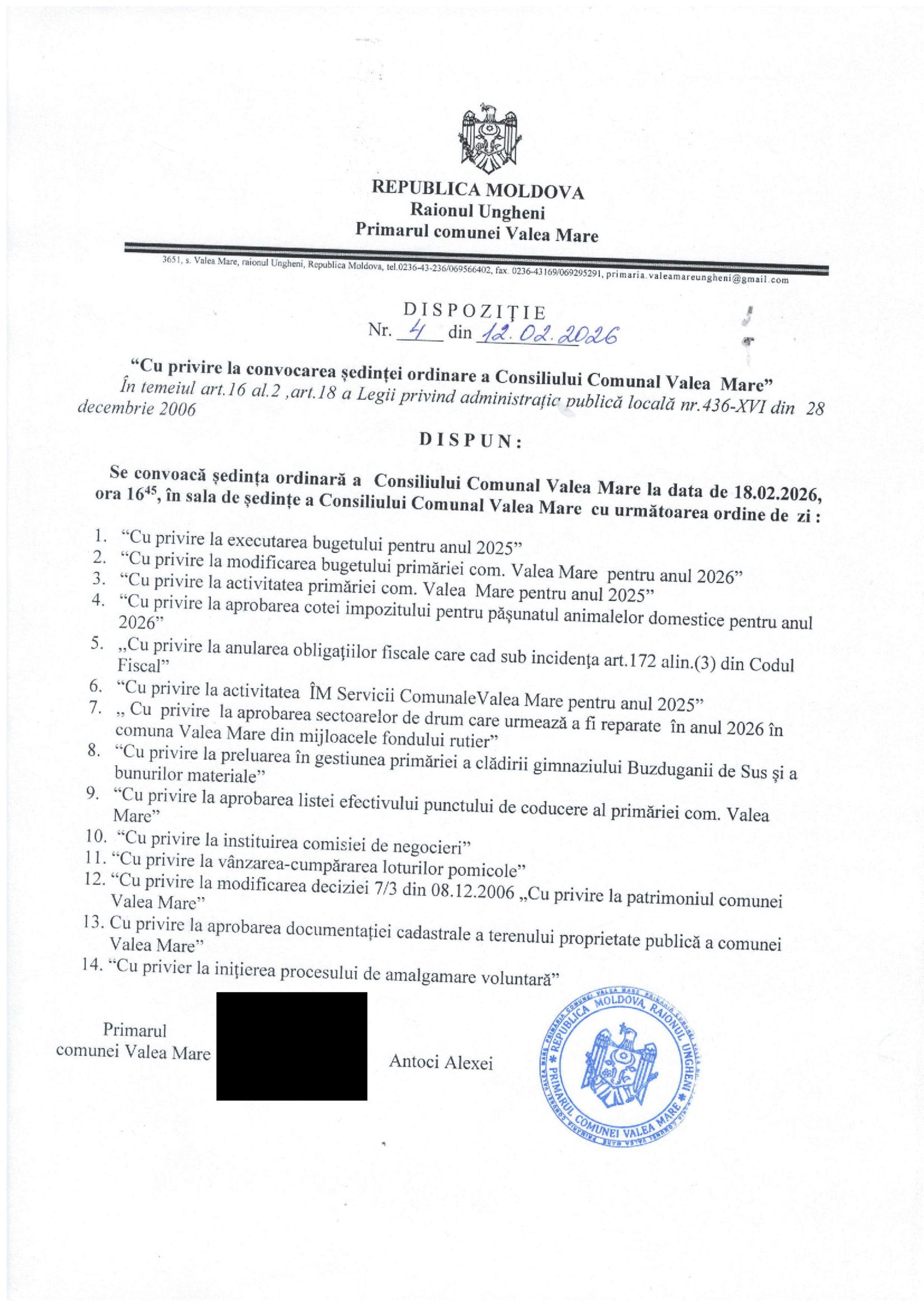 Anunț cu privire la convocarea ședinței ordinare a Consiliului Comunal Valea Mare