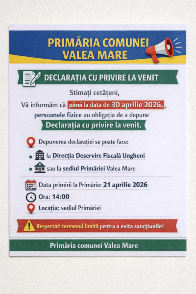 🚨 ATENȚIE, LOCUITORI AI COMUNEI VALEA MARE! 🚨