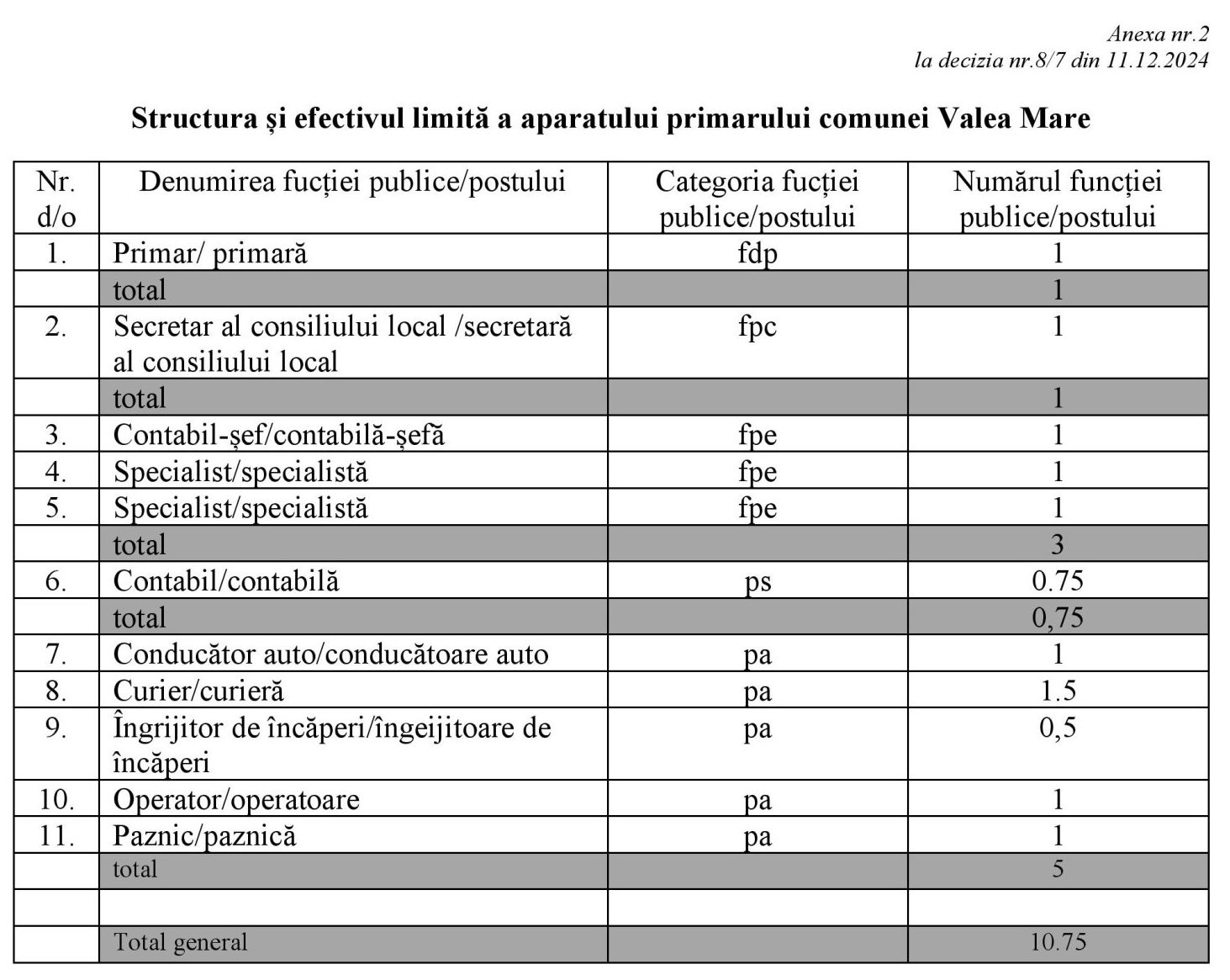 STATUL DE PERSONAL al aparatului Primărie comunei Valea Mare, raionul Ungheni