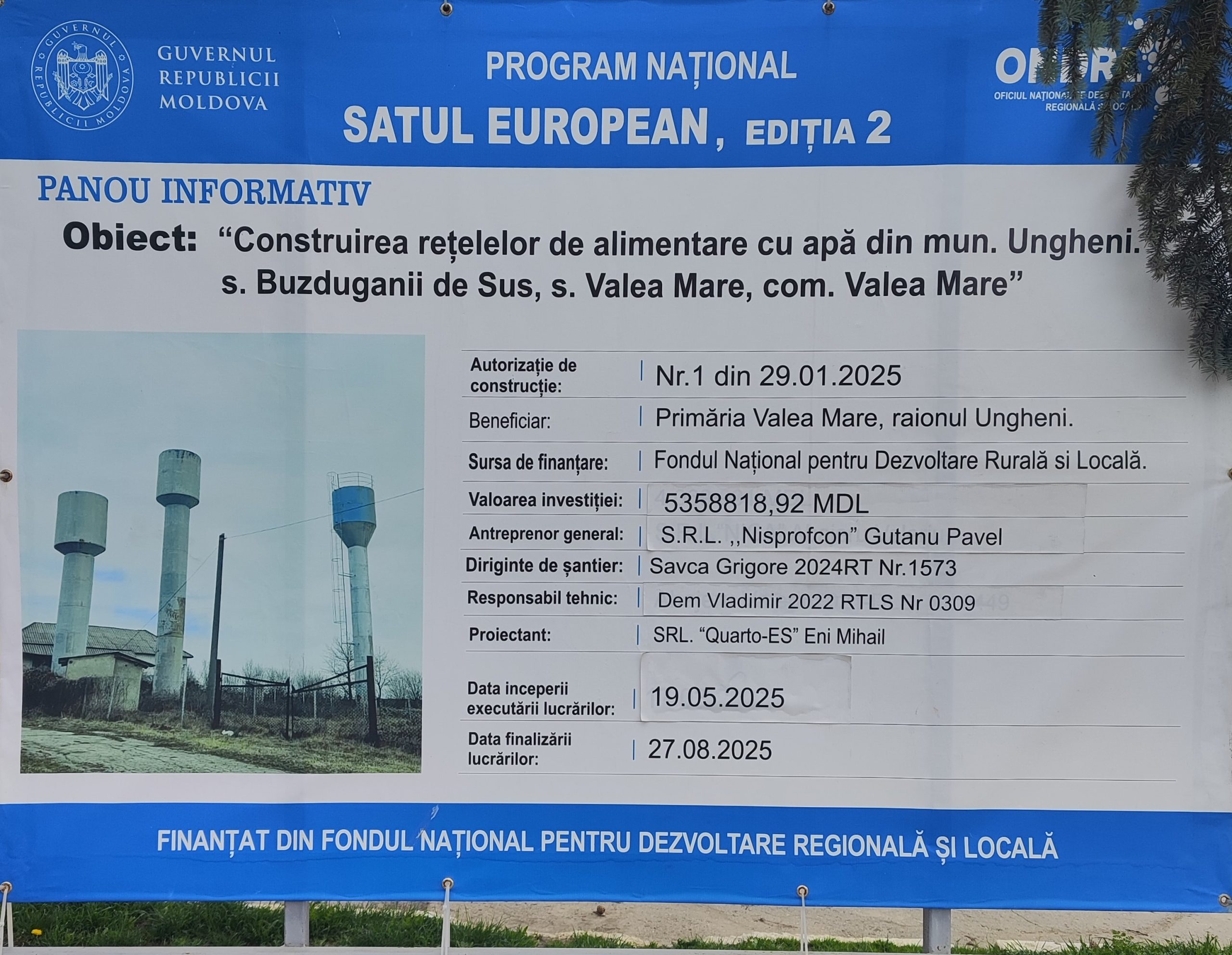 - obiectivul “Construirea rețelelor de alimentare cu apă din mun.Ungheni- s.Buzduganii de Sus, s.Valea Mare, com.Valea Mare”, fiind finanțate de FNDRL